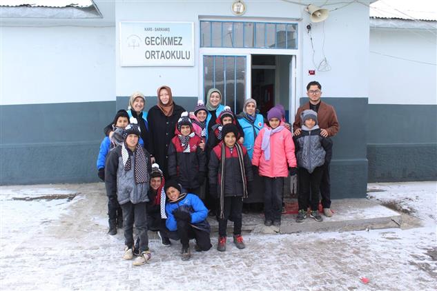 Kars İl Müftülüğü koordinesinde Türkiye Diyanet Vakfı Kars Şubesi Kadın Kolları ve Gönüllüleri hayırseverlerin katkı ve destekleriyle temin edilen mont, atkı ve bereler İl Müftü Yardımcısı Fatma SAVCI'nın da katılımlarıyla Kars Sarıkamış Gecikmez Köyü Anaokul, İlkokul ve Ortaokul öğrencilerine dağıtılarak çocukların yüzünü güldürmeye ve gönülleri ısıtmaya devam ediyor.