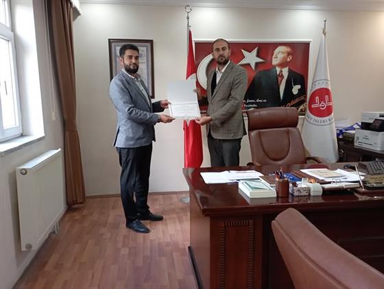 2025 Yılı Vekâletle Kurban Organizasyonu kapsamında, kurban sürecinin işletilmesinde göstermiş olduğu üstün gayret ve özverili çalışmalarından dolayı Türkiye Diyanet Vakfı Genel Merkezi tarafından Teşekkür Belgesi ile ödüllendirilen Veri Hazırlama ve Kontrol İşletmeni (VHKİ) Faruk ÇİL hocamıza belgesini, İlçe Müftümüz Sayın Orhan AÇAN tarafından takdim edildi.